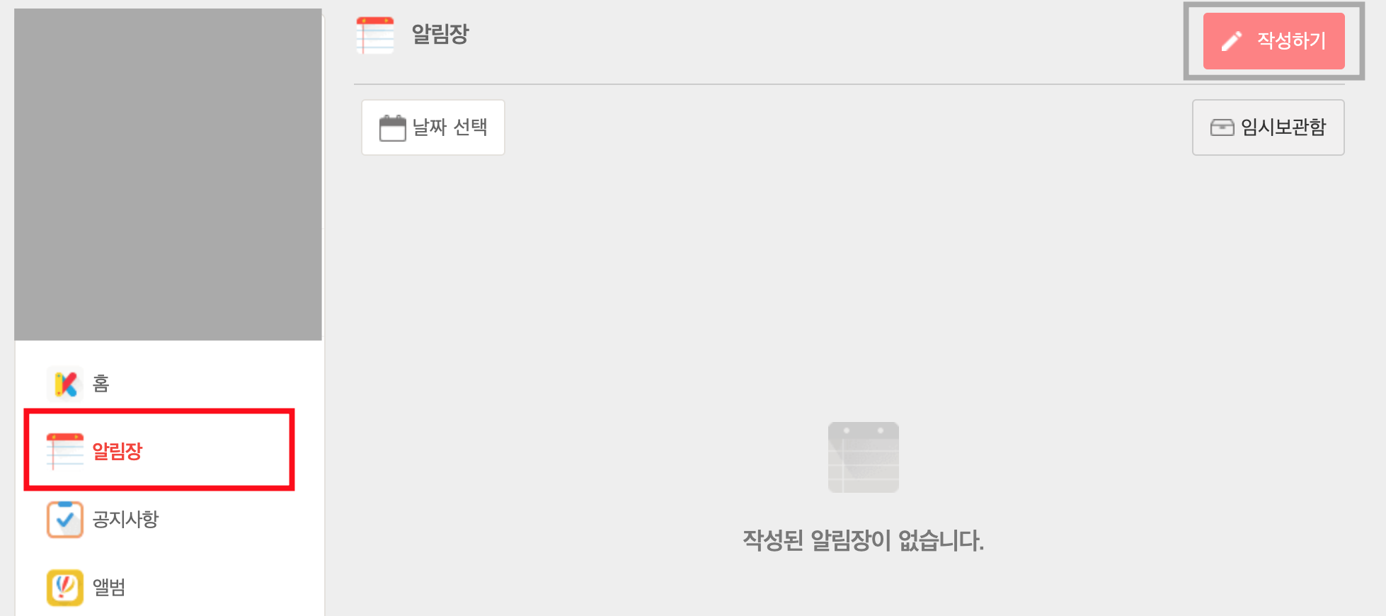 2. 알림장으로 이동해서 작성하기를 눌러주세요.