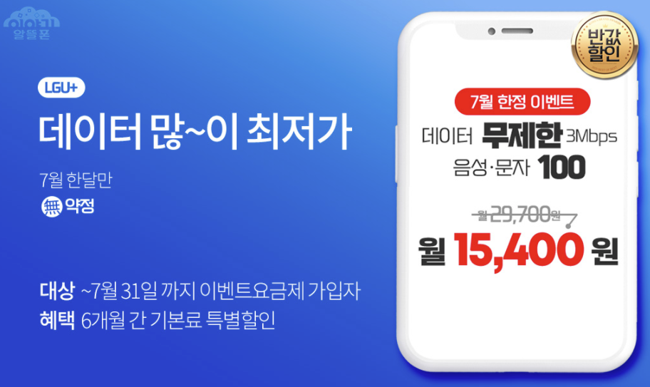 7월말까지 이야기 알뜰폰 무제한 요금제(이야기U 데이터 15G+) 상품에 가입하면 15,400원에 이용할 수 있습니다.