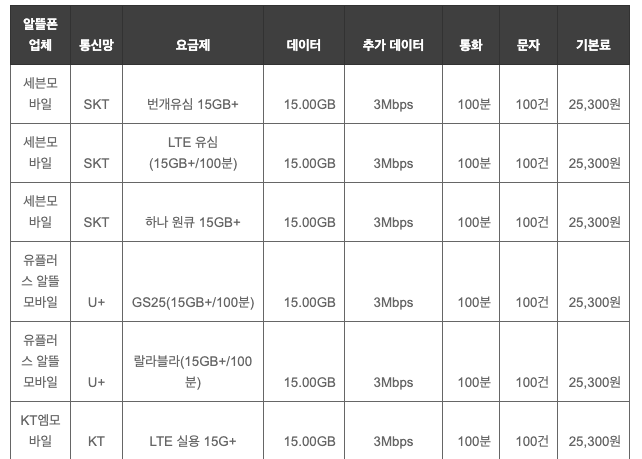 앞서 보셨겠지만 데이터 무제한에 음성 100분, 문자 100분인 요금제는 25,300원에 판매중입니다.