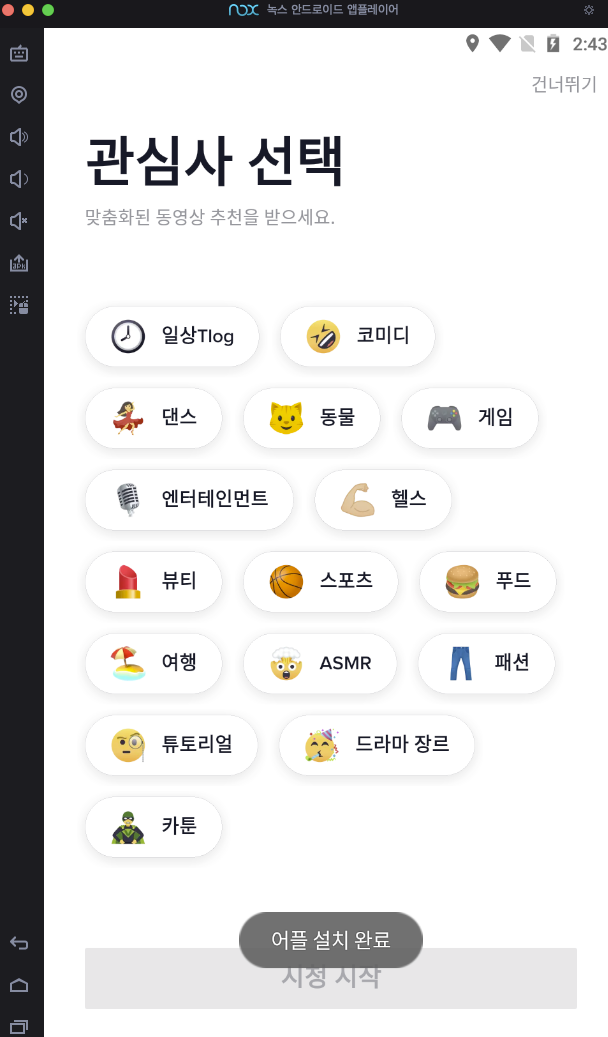 설치하면 익숙한 틱톡 로고가 나타나고, 관심사 선택이 나옵니다.