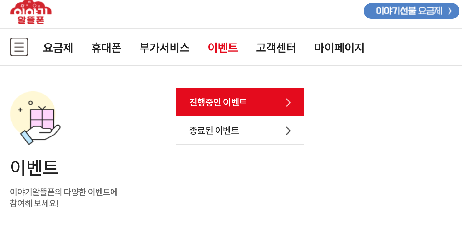 1. 이야기 알뜰폰 홈페이지에 접속하시면, 이벤트, 진행중인 이벤트로 이동합니다.