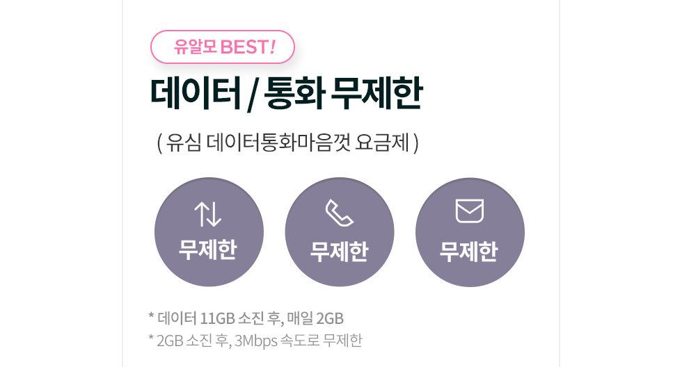 | 알뜰모바일(유플러스망) | 유심 데이터 통화 마음껏 | 11GB+매일 2GB+3Mbps 무제한/무제한/무제한 | 33,000원 |
