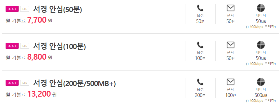 서경모바일에서는 음성통화량이 50분/100분/200분에 따라서 조금씩 차이가 있습니다.