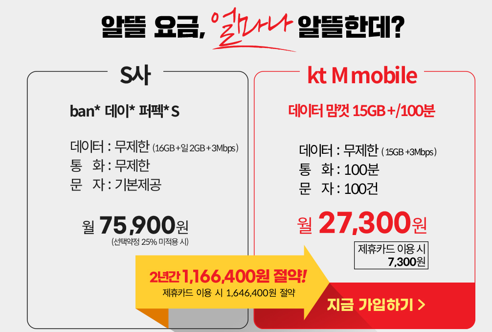 KT엠모바일에서 사용할 경우 절반 이하가격인 약 3만원에 이용할 수 있어요.