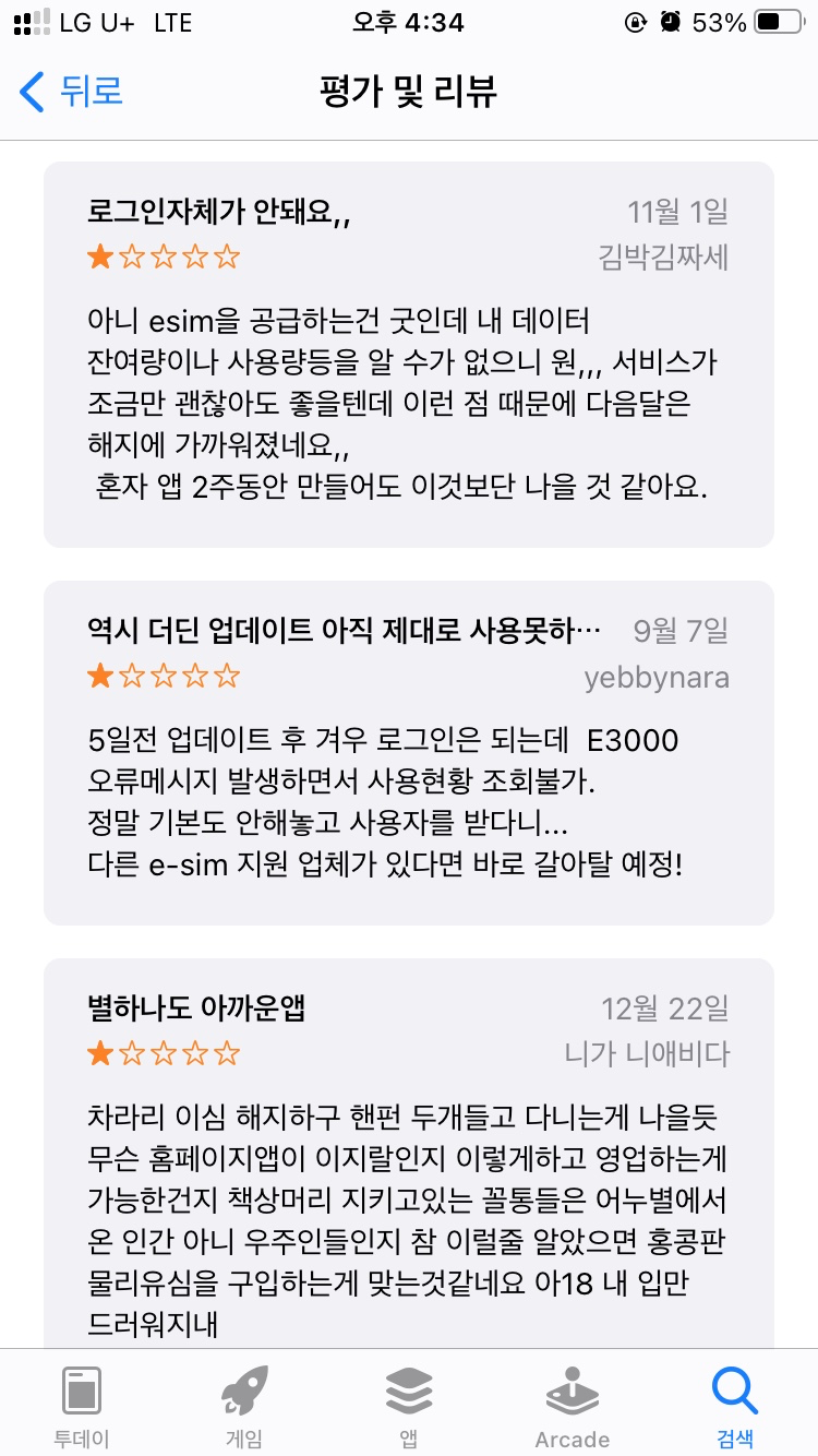 1.5점에, 평가는 악평이 자자하죠. 리뷰 남긴 글들을 보면 전부다 "로그인 오류"를 지적하는 글입니다.