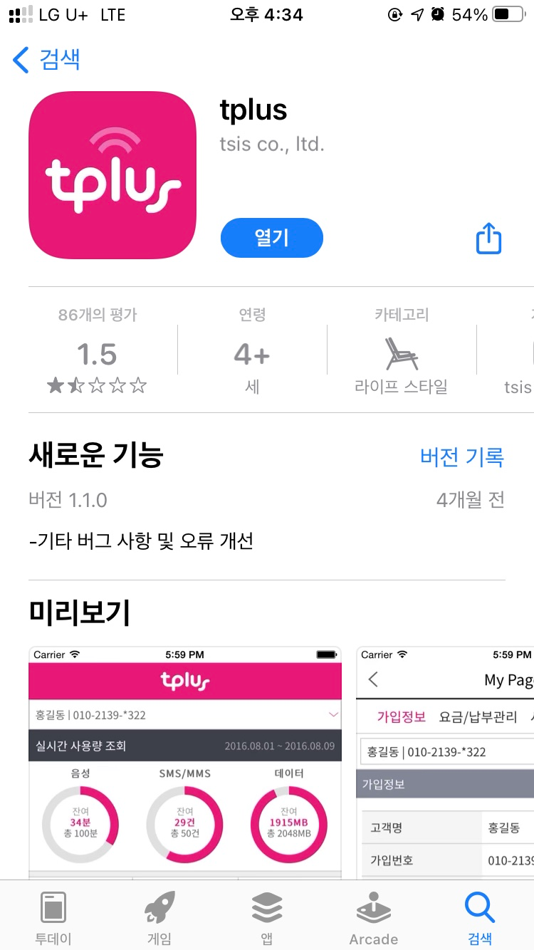 아이폰 앱스토어에 티플러스 앱의 평점을 보면 처참한 수준입니다.