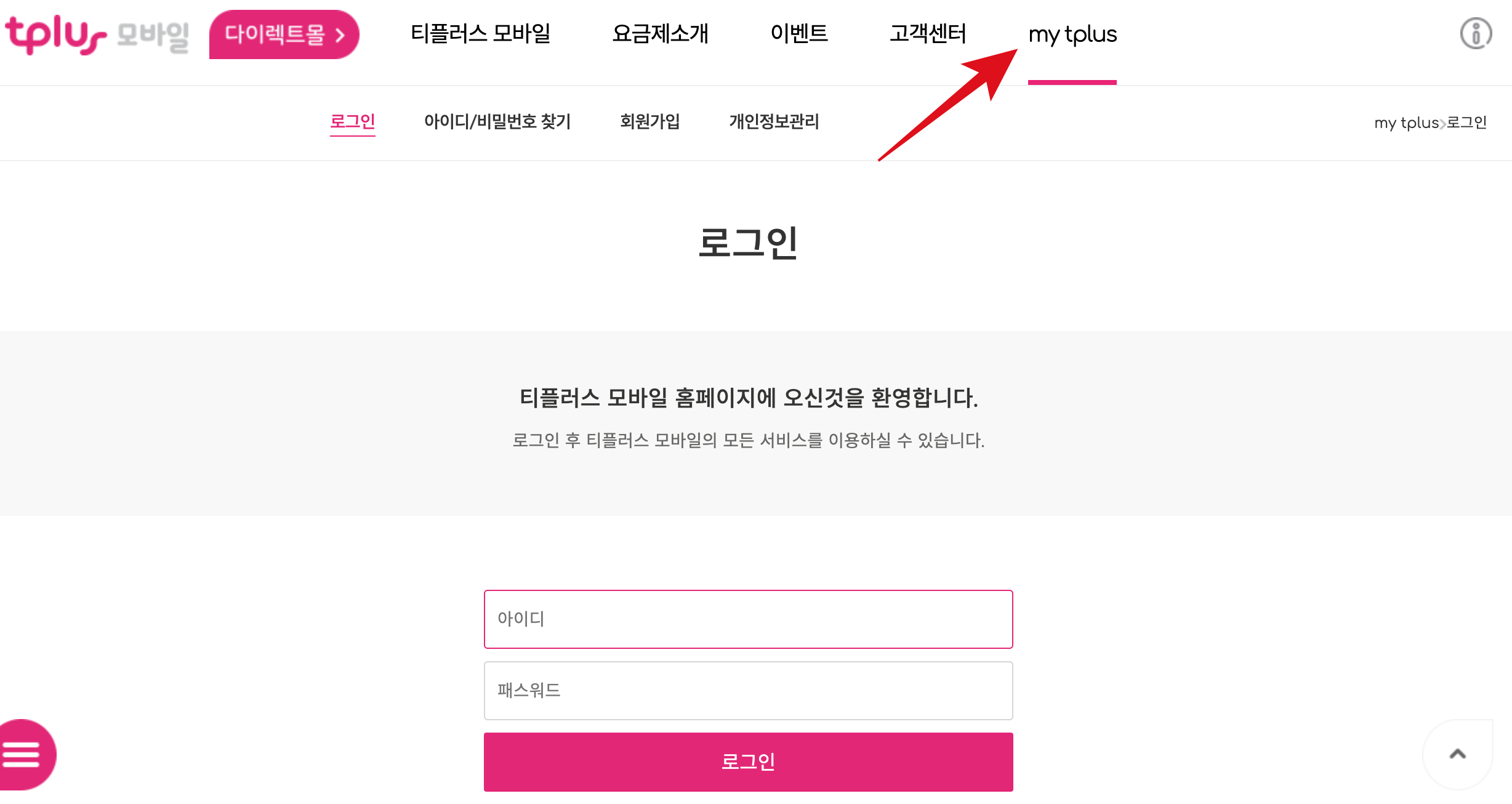 1. 티플러스 모바일 홈페이지에 접속합니다.
