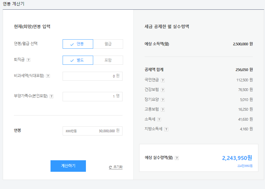 연봉 3000만원은 한달 세전 250만원인데 4대보험과 세금으로 25만원이 공제되어 월 224만원이 실수령액입니다.