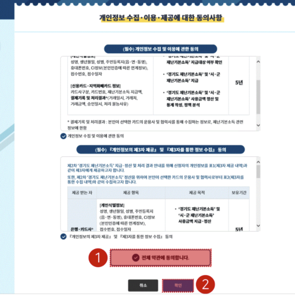 재난지원금을 신용카드, 체크카드 또는 경기지역화페에 지급하기 위해선 개인정보 동의가 꼭 필요합니다.