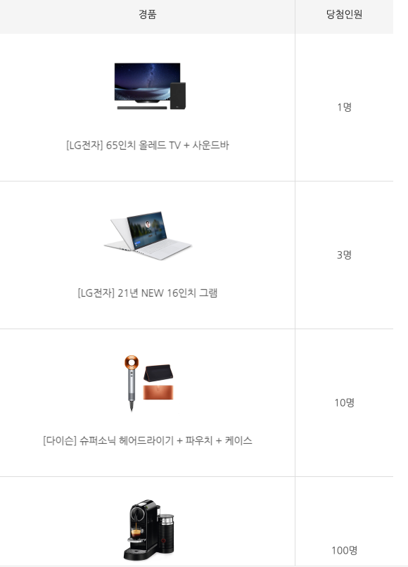 경품은 1등은 엘지전자 65인치 올레드 TV, 2등은 16인치 그램 등 다양한 선물을 준비했네요.