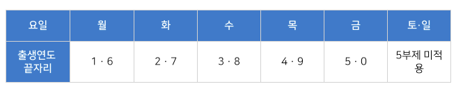 출생년도에 따라 신청가능요일이 정해져있습니다.
