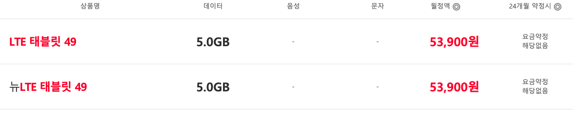 바로 LTE태블릿49 요금제인데요. 5GB 데이터에 53,900원입니다.