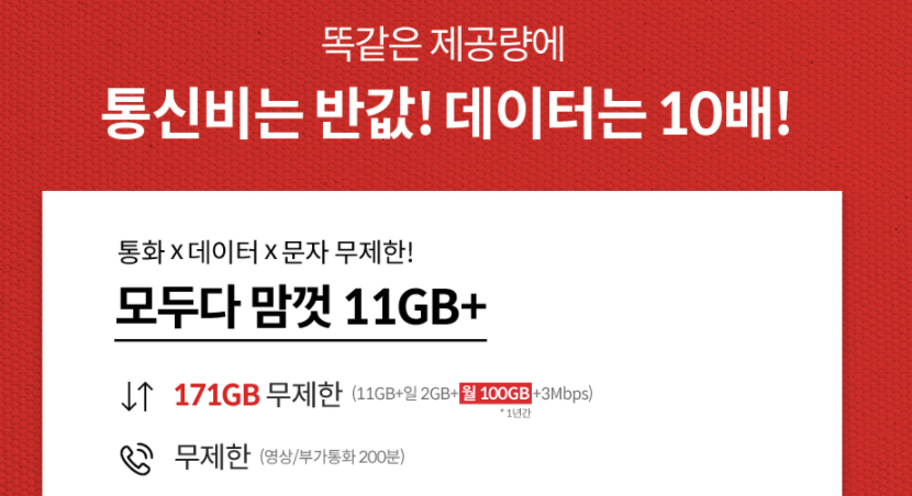 원래 한달에 11GB 주던걸, 100GB를 더 얹어주고 있으니 말 다했죠?