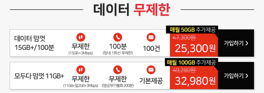 이정도 데이터라면 유투브, 넷플릭스를 매일매일 보더라도 다 쓰지 못할정도가 아닐까 싶어요.
