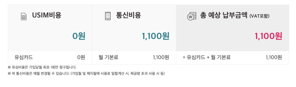 무료통화, 무료문자, 무료데이터가 다 없는 요금제이지만 기간한정 없이 쭈욱 1100원입니다.