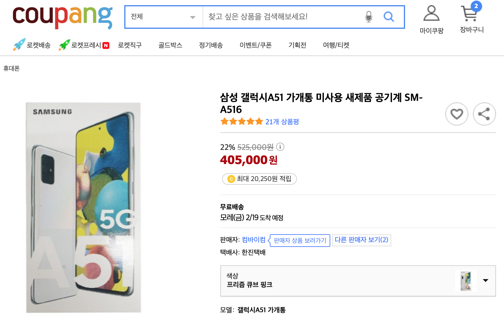 쿠팡에서는 갤럭시 A51을 약 20% 할인된 405,000원에 판매하고 있어요.