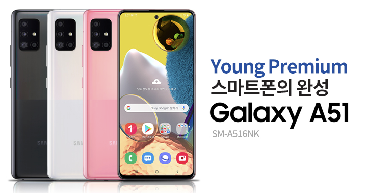갤럭시 A51은 영 프리미엄이란 캐치프라이를 가지고 있습니다.