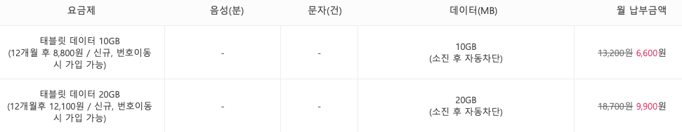 보통 이러한 태블릿 요금제는 10GB는 9900원, 20GB는 11000원 가격이 형성되어 있는데요.