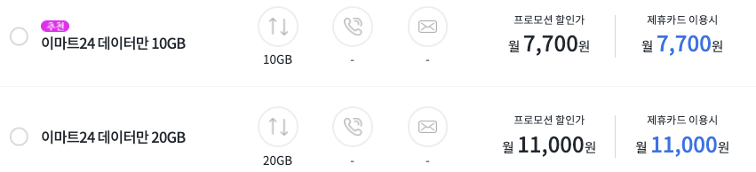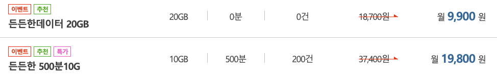 마찬가지로 10GB, 20GB로 나눠져있는데 10GB 요금제가 프로모션중입니다.