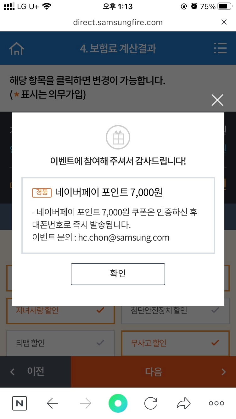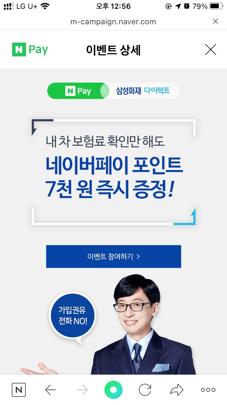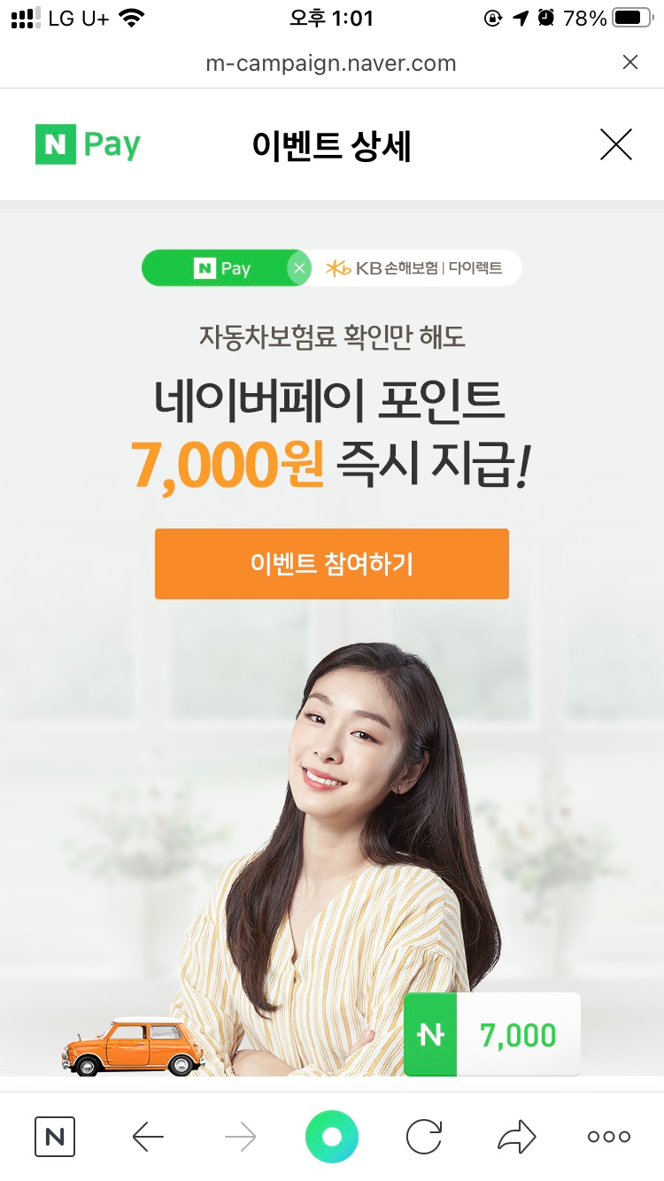 네이버 페이에서는 다양한 이벤트를 진행하고 있는데 그 중 다이렉트 자동차 보험이 꽤 많은 네이버 페이를 주네요.