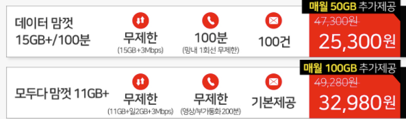 특히 100GB, 50GB 씩 추가 데이터를 무료로 제공하여 데이터를 많이 쓰는 분들에게 큰 인기를 얻고 있죠.