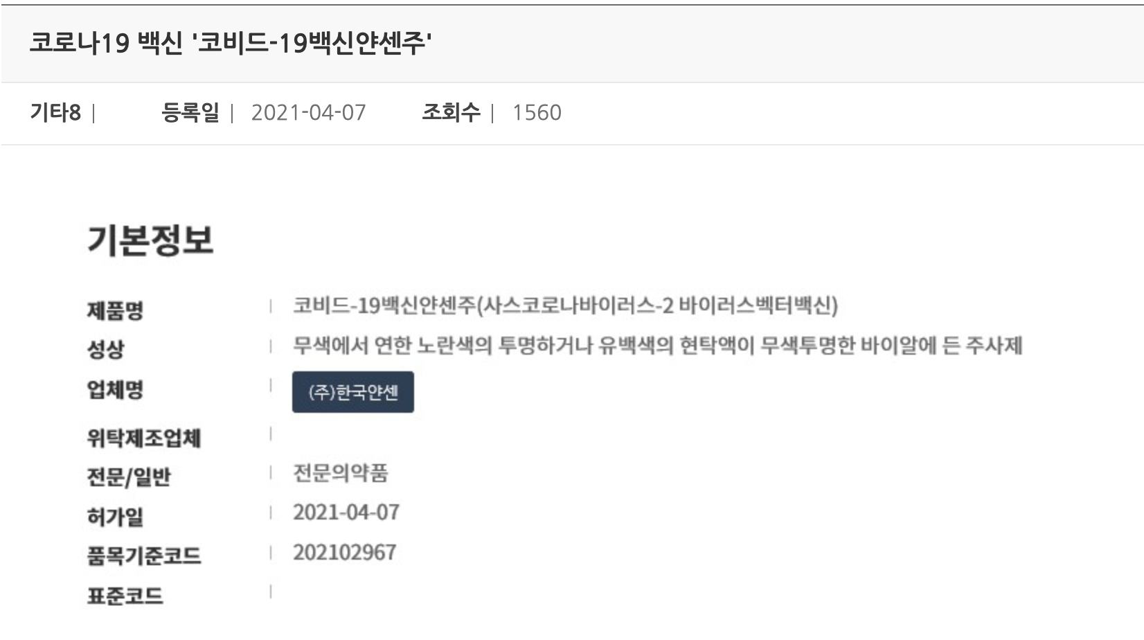 한국 식약처에 한국얀센이 승인신청을 하여 2021년 4월 7일 최종 품목허가가 된 제품입니다.