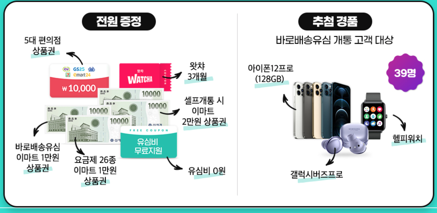 신세계 상품권이 무려 5만원, 게다가 이마트24에서 유심 구매하고 가입하면 이마트24 상품권이 2만원입니다.