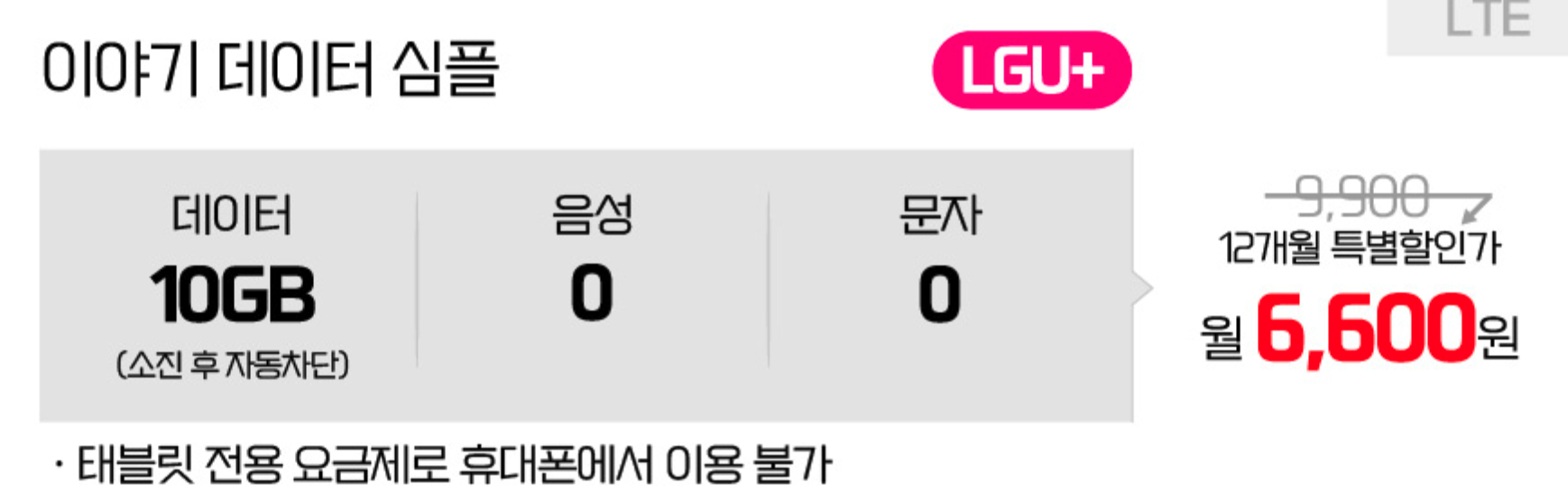 안심모바일의 <이마트24 데이터만 10GB>요금제를 견제하기 위해 이야기 알뜰폰에도 10GB에 6,600원 요금제가 출시되었습니다.