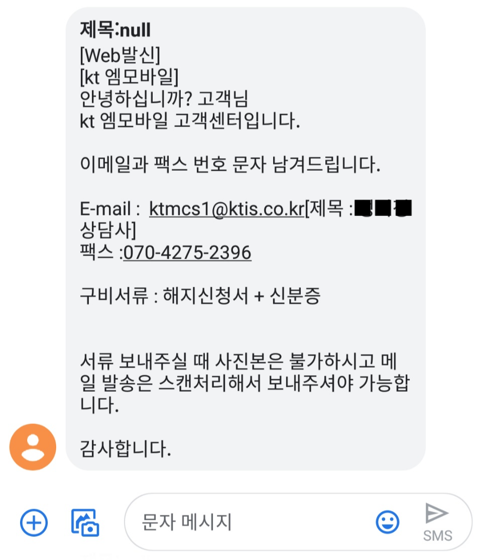 KT엠모바일은 고객센터 통화 > 해지서류 접수 > 해지처리 순서로 진행됩니다.