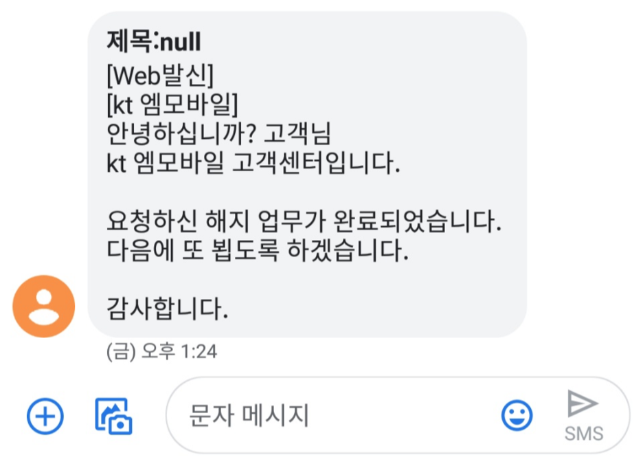해지가 완료되면 요청했던 번호로 해지완료 문자가 옵니다.