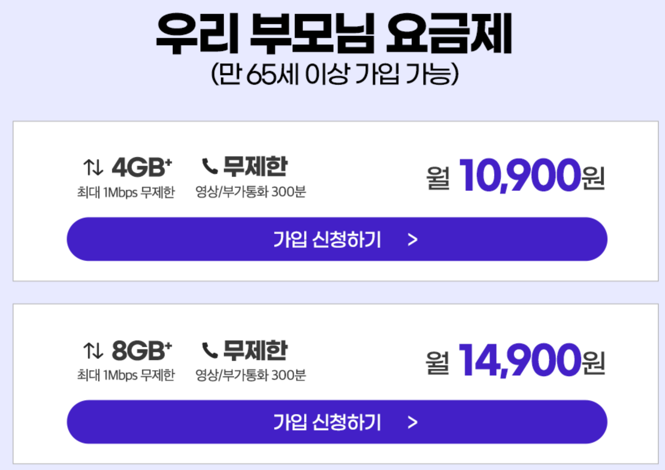 어르신을 위한 우리 부모님 요금제(일명 시니어 요금제)가 있습니다. 만 65세 이상만 가입 가능한 요금제라 상대적으로 저렴합니다.