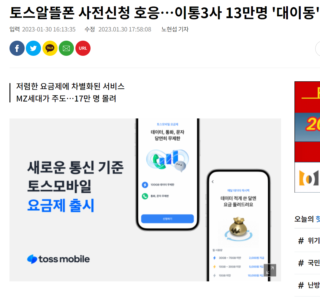 사실 17만명 사전신청은 토스의 낚시 기사입니다. 토스페이지에서 이 요금제가 나오면 알려달라는 알림 신청을 한 것을 '사전 신청'으로 둔갑한 것인데요. 처음 보는 분들은 '벌써 이렇게 인기가 많다고?'라고 헷갈리실 수 있습니다.