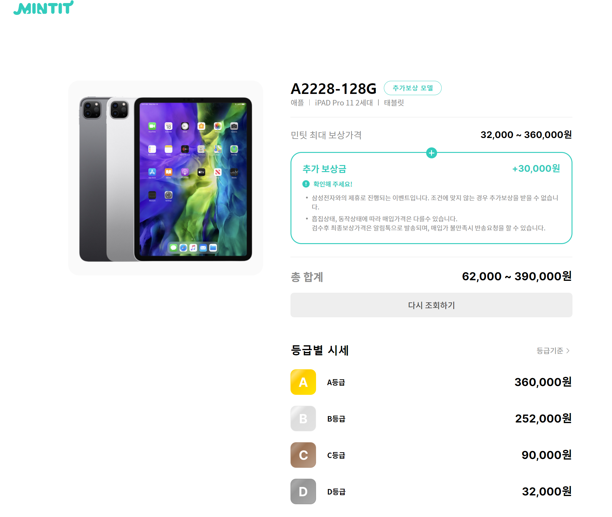 민팃 스마트폰 시세는 앱에서만 확인이 가능하지만 태블릿은 앱 설치 없어도 확인할 수 있습니다.