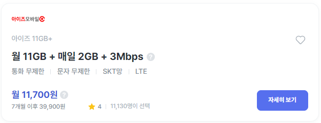 | 아이즈모바일 | 아이즈 11GB+ | 11,700원 | 7개월 이후 39,900원 | 바로가기 |