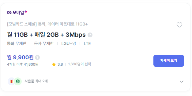 | KG모바일 | [모빌카드 스페셜] 통화, 데이터 마음대로 11GB+ | 9,900원 | 4개월 이후 41,800원 | 바로가기 |
