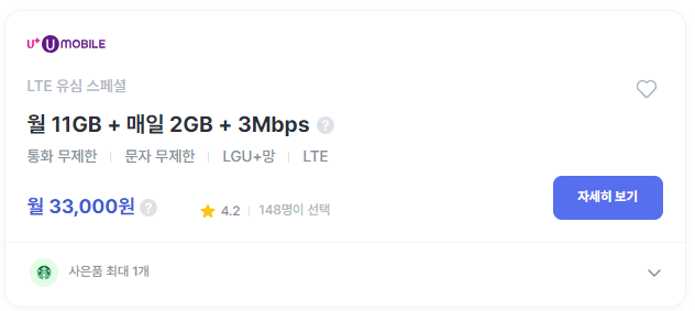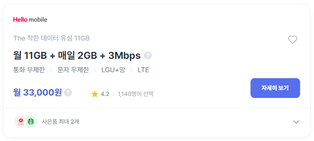 | 헬로모바일 | The 착한 데이터 유심 11GB | 33,000원 | 신세계 3만원, 스타벅스 6잔(원칩) | 바로가기 |