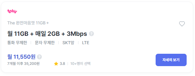 | 티플러스 | The 완전마음껏 11GB+ | 11,550원 | 7개월 이후 35,200원 | 바로가기 |