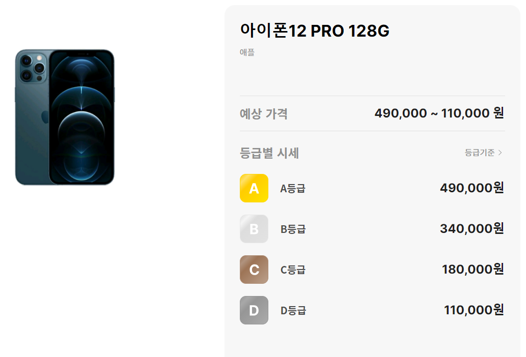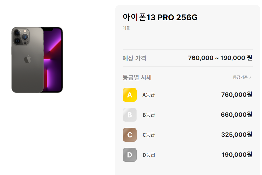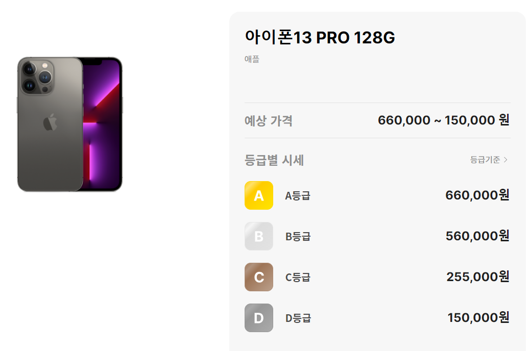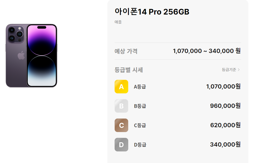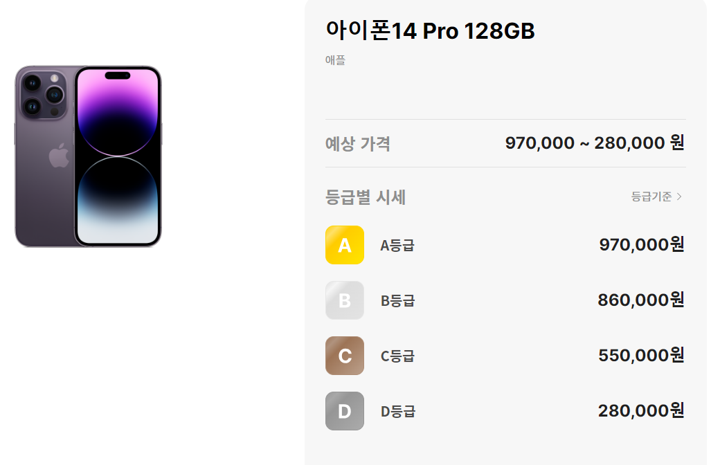 민팃 아이폰 등급은 A등급부터 D등급까지 있습니다. A는 최상이고, D는 최하등급이죠,