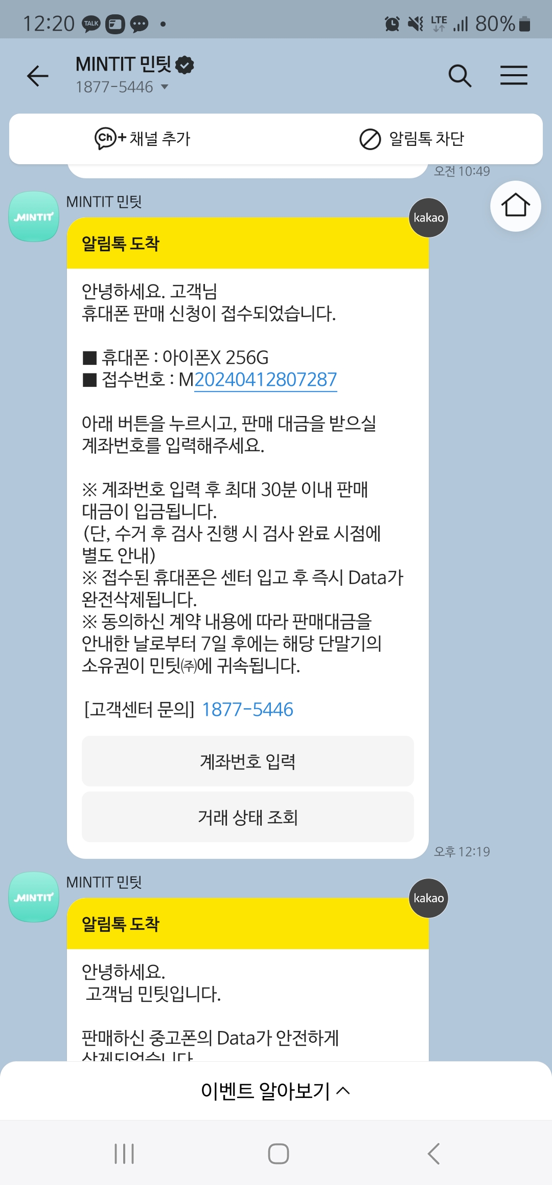 거래가 완료되면 민팃으로부터 카톡이 하나 도착해요.