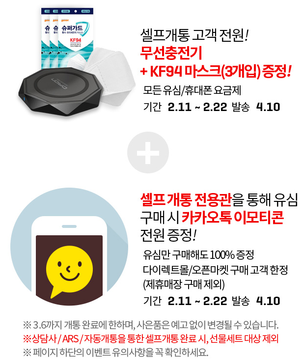 1) 셀프개통시 무선충전기 + 마스크 3개