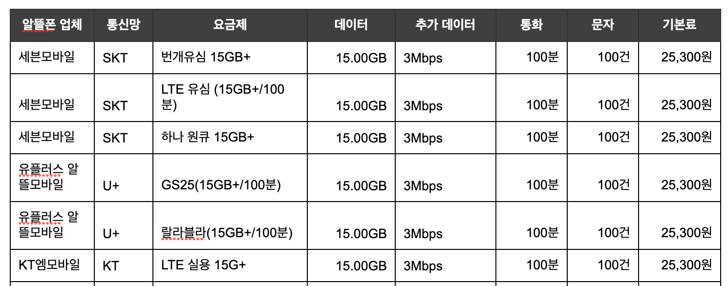 알뜰폰 메이저 4개 업체의 가격인 25,300원보다 비싸지게 됩니다.