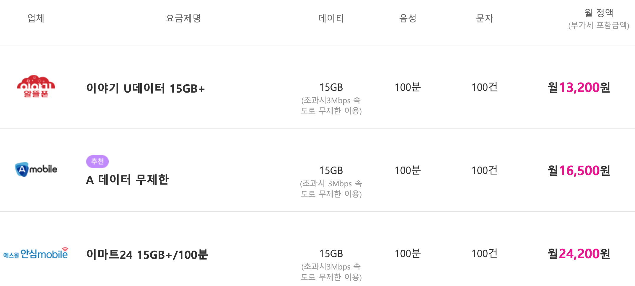 이야기알뜰폰, A모바일, 안심모바일은 조금 더 낮은 가격으로 판매하고 있습니다.