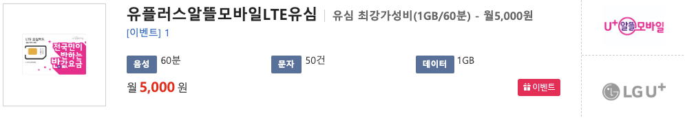 3) 알뜰모바일 유심 최강가성비(1GB/60분)