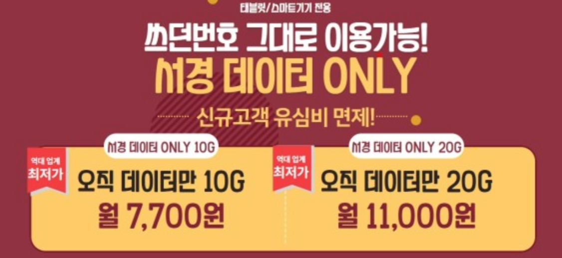 7,700원에 판매하고 있는 서경모바일도 눈물을 머금고 <오직 데이터만 10G> 요금제를 6,600원으로 할인판매를 시작했습니다.