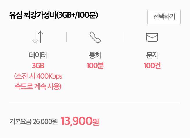 <유심 최강가성비(3GB+/100분>은 데이터가 모두 소진되더라도 400kbps로 무제한 데이터 사용이 가능합니다.