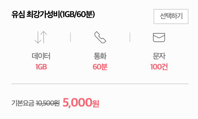 커피 한 잔 값인 5,000원짜리인데요. 요금이 저렴하면서도 데이터 1GB를 주고 음성 60분, 문자 100건인데 라이트 유저가 사용하기엔 딱 좋은 상품입니다.