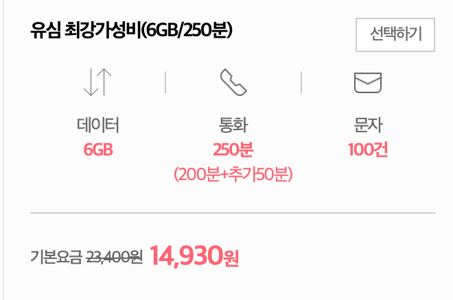 또 <유심 최강가성비(6GB/250분)> 15,000원으로 6GB 데이터를 사용할 수 있는 가성비 좋은 요금제입니다.